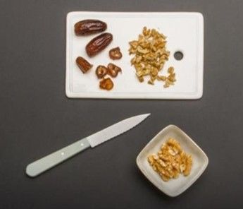 Datteln in ca. 0,3 cm dünne Ringe schneiden. Walnüsse grob hacken.